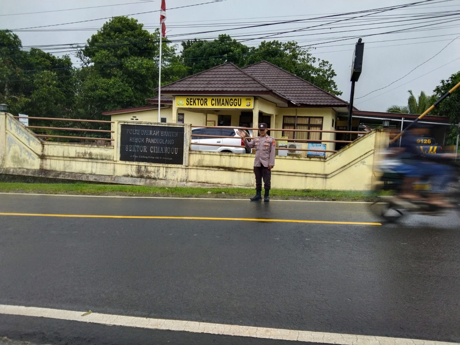 POLRES PANDEGLANG-Kanit Binmas Polsek Cimanggu Bripka Asep Saprudin bersama personil lainnya melaksanakan giat Strong Point di jalan Cimanggu sumur km 12 tepatnya di depan Mako Polsek Cimanggu.Kamis (06/07/2023).