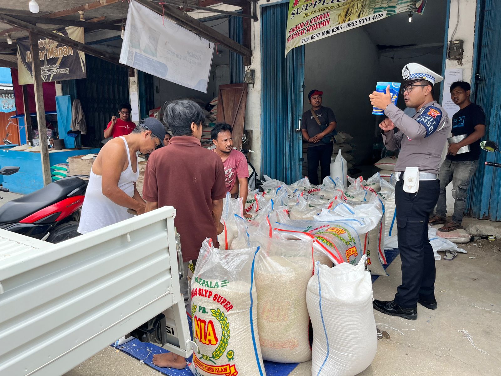 Baraknews Polres Karawang – Tingkatkan kepatuhan tertib berlalu lintas, Satlantas Polres Karawang melaksanakan sosialisasi UU LLAJ No 22 Tahun 2009 di Pasar Beras Tuparev, Karawang, Senin (6/3/2023).