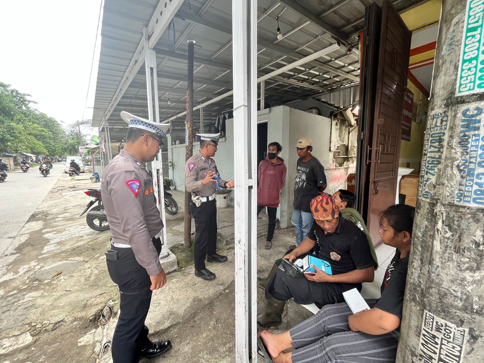 Anggota Satlantas Cakep juga membagikan brosur kepada masyarakat tentang penghapusan data kendaraan bermotor sesuai Pasal 74 UU No 22 Tahun 2009 tentang Lalu Lintas dan Angkutan Jalan.