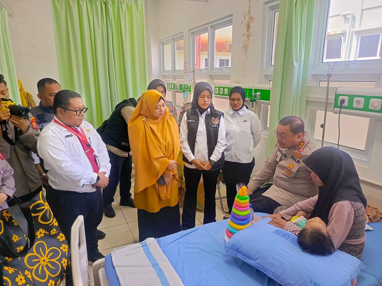 Terlihat Kapolres Purwakarta, AKBP Lilik Ardhiansyah didampingi PJU Polres Purwakarta dan sejumlah personel Polwan itu membawa mainan anak, seperti boneka sebagai alat bantu menghibur bocah perempuan berinisial QFY (22 bulan) tersebut di RSUD Bayu Asih Purwakarta.