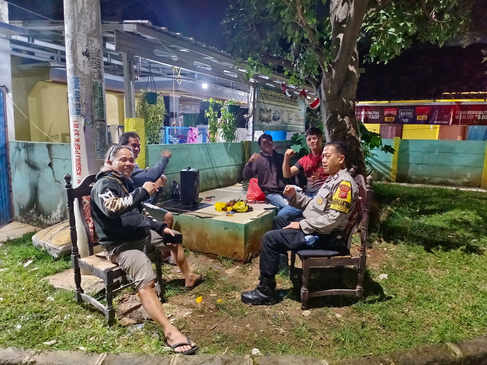 Bhabinkamtibmas Desa Cengkong Aiptu Oyib Sujati melaksanakan kegiatan sambang warga binaan yang sedang melakukan jaga malam di pos Kamling perum PCP.