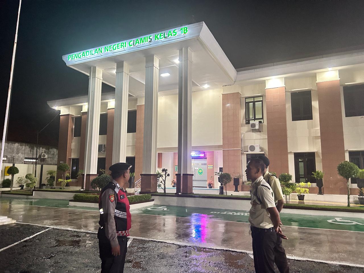 CIAMIS ~ Personel Satuan Samapta Polres Ciamis Polda Jabar melaksanakan patroli kamtibmas ke kawasan objek vital seperti perkantoran di Kabupaten Ciamis. Kegiatan ini sekaligus untuk berkoordinasi dan pembinaan ke satuan keamanan (Satpam) perkantoran. Seperti ini dilakukan ke Anggota Satpam Kantor Pengadilan Negeri Ciamis, Kecamatan Ciamis, Kabupaten Ciamis, Jawa Barat, Jumat, 23 Januari 2026, malam.