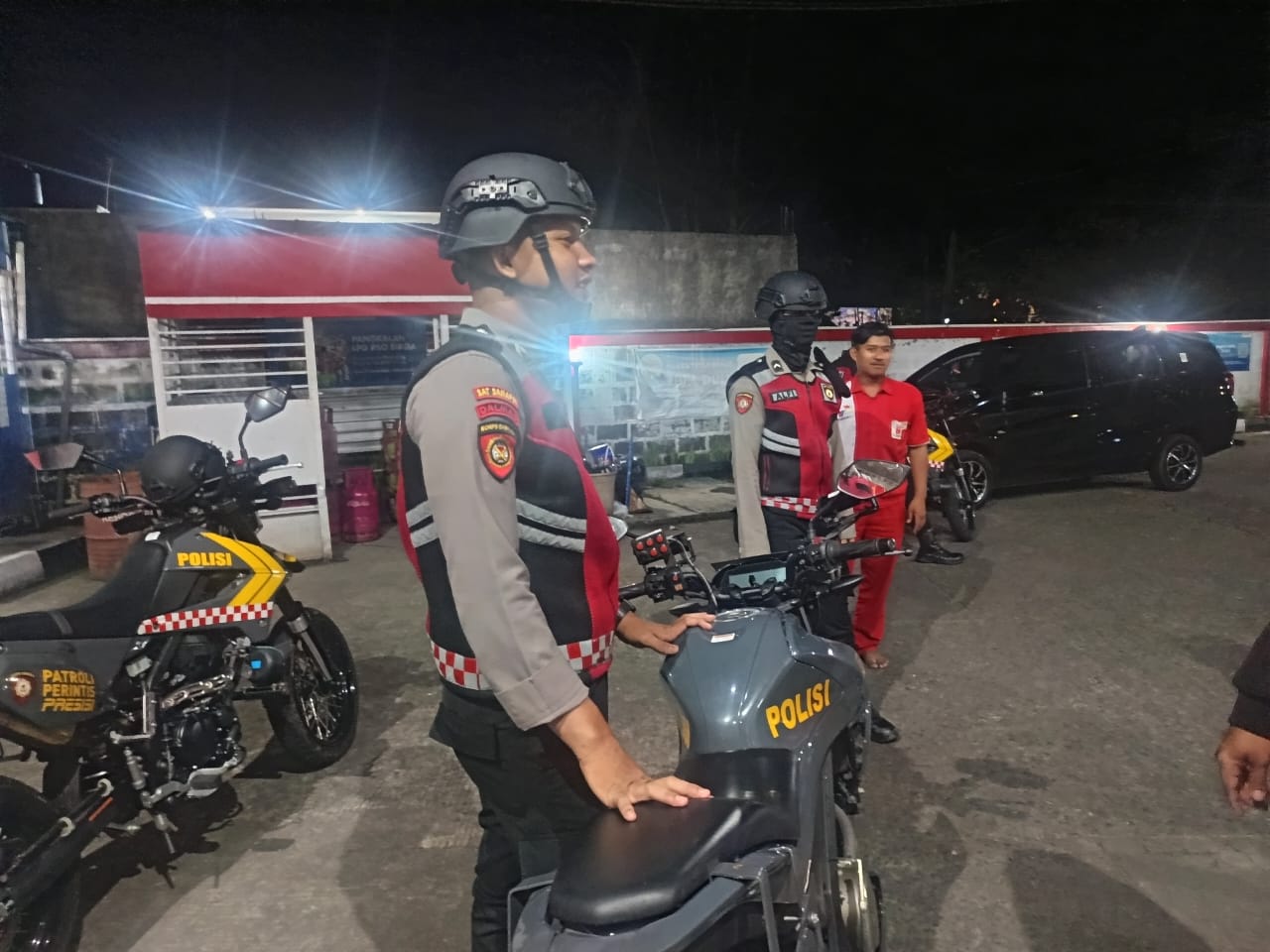 Para personel hadir berpatroli di kawasan pusat kota dan objek vital serta keramaian masyarakat di menggunakan kendaraan dinas Polri Roda 2. Sebanyak 4 unit dikerahkan Roda 2 untuk mendatangi SPBU Permata Bunda, Ciamis, Ciamis, Kabupaten Ciamis, Jawa Barat, Senin (29/12/2025), dini hari.