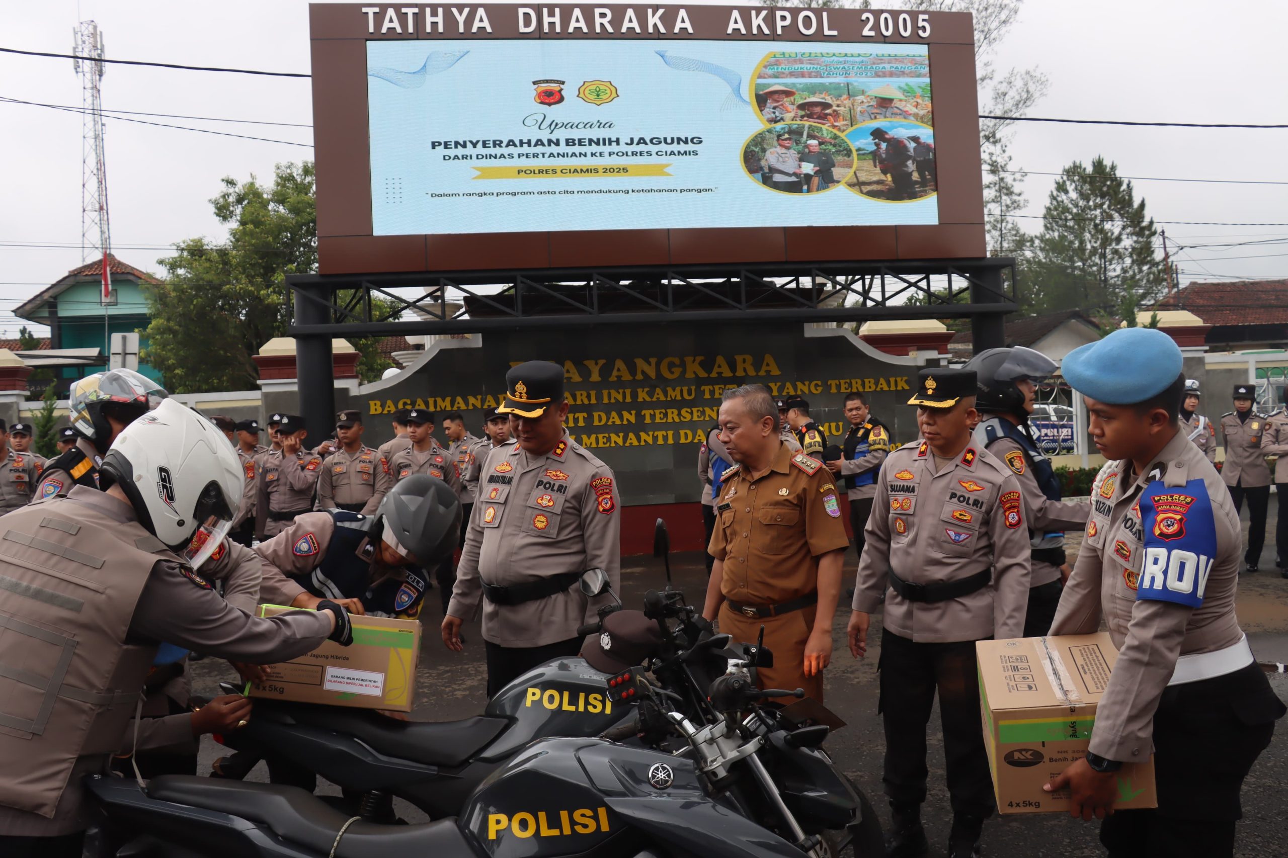 CIAMIS – Polres Ciamis kembali menunjukkan komitmennya dalam mendukung program ketahanan pangan nasional. Pada Senin (22/9/2025), Polres Ciamis menerima bantuan 16 ton lebih benih jagung dari Dinas Pertanian dan Ketahanan Pangan Kabupaten Ciamis. Serah terima ini dilangsungkan dalam sebuah upacara di halaman apel Mapolres Ciamis.