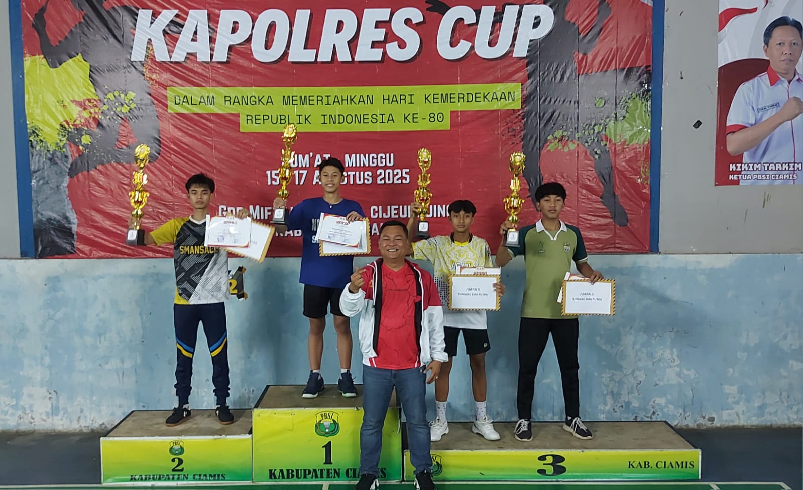 Kapolres Ciamis, AKBP H. Hidayatullah, S.H., S.I.K., didampingi Wakapolres Kompol Sujana, S.Pd., hadir langsung untuk menyaksikan laga final dan memberikan apresiasi kepada para peserta. Kejuaraan yang diselenggarakan oleh PBSI Kabupaten Ciamis ini berlangsung selama tiga hari, mulai tanggal 15 hingga 18 Agustus 2025, dan diikuti oleh 238 peserta dari berbagai tingkatan sekolah.