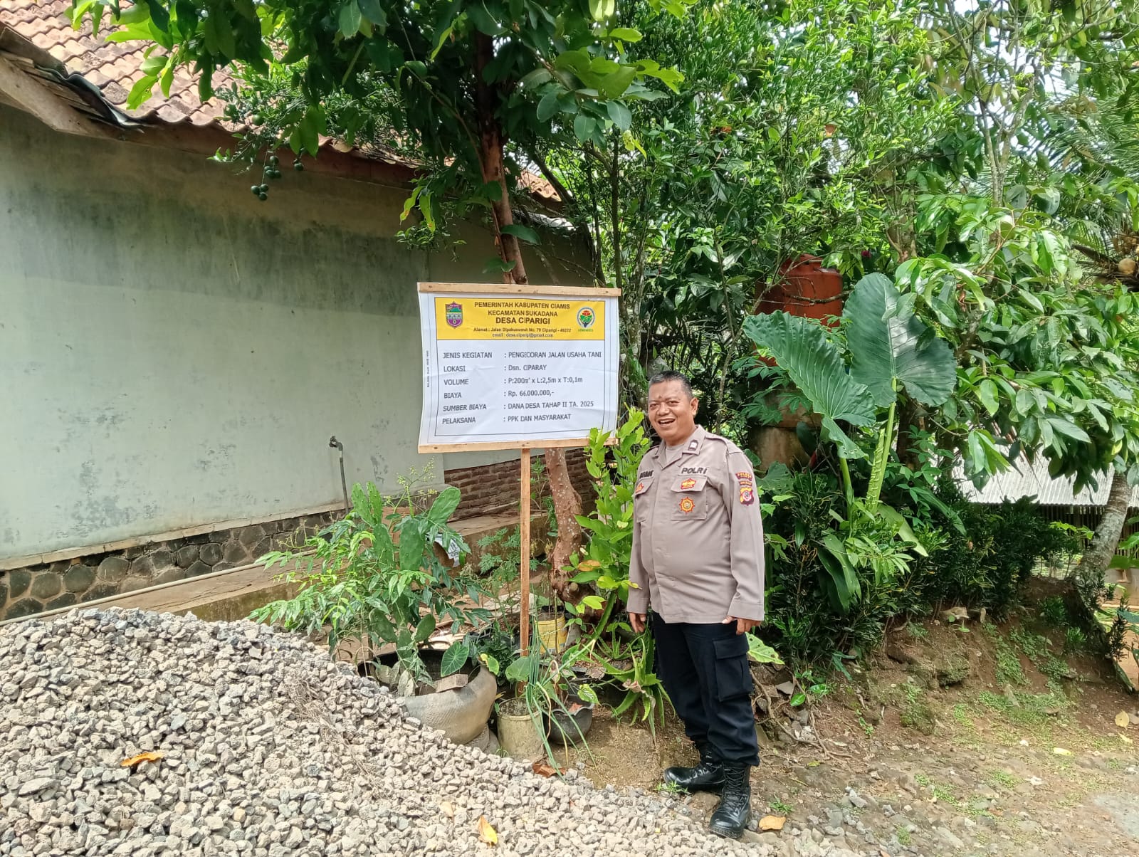 CIAMIS ~ Personel Polsek Sukadana Polres Ciamis Polda Jabar melaksanakan kegiatan humanis dengan hadir memonitoring pembangunan jalan rabat beton. Pembangunan jalan poros desa ini berada di Jalan Usaha Tani, Dusun Ciparay, Desa Ciparigi, Kecamatan Sukadana, Kabupaten Ciamis, Jawa Barat, Sabtu (20/9/2025).