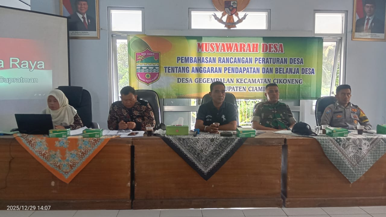 CIAMIS ~ Polsek Cikoneng Polres Ciamis Polda Jawa Barat mengikuti kegiatan Musyawarah Desa tentang Penyampain Rancangan Peraturan Desa tentang Rencana Kerja Pemerintah Desa (RKP Desa) Tahun 2026. Kegiatan tersebut dilaksanakan di Aula Desa Gegempalan, Kecamatan Cikoneng, Kabupaten Ciamis, Jawa Barat, Selasa (30/12/2025).