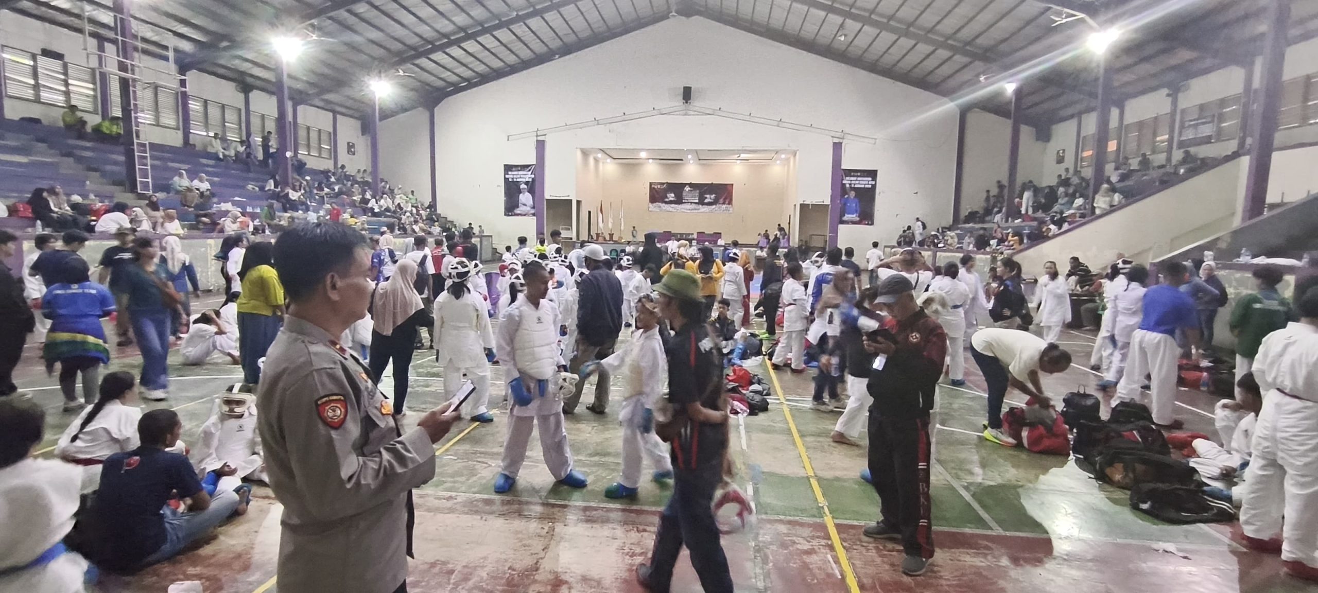 Open Turnamen Karate Satria Galuh ini mengadirkan pesilat terbaik dari wilayah Ciamis. Sementara para personel yang bertugas mereka bersiaga selama gelaran turnamen di kawasan Gelanggang Galuh Taruna (GGT) Ciamis, Kabupaten Ciamis, pada Sabtu, 10 Januari 2026, kemarin.