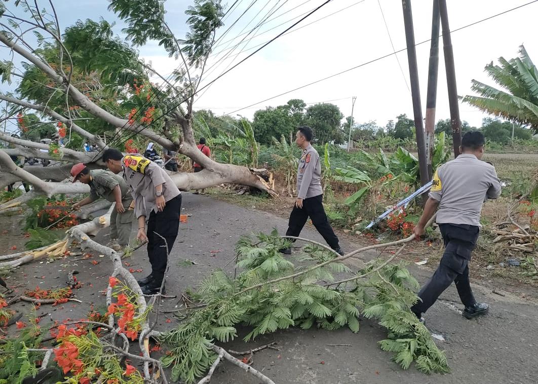 Jabar—Polsek Gabuswetan, jajaran Polres Indramayu Polda Jabar melakukan evakuasi pohon tumbang yang menghalangi Jalan PU Saradan – Wanguk di Desa Babakanjaya Blok Babakan Dampyang.
