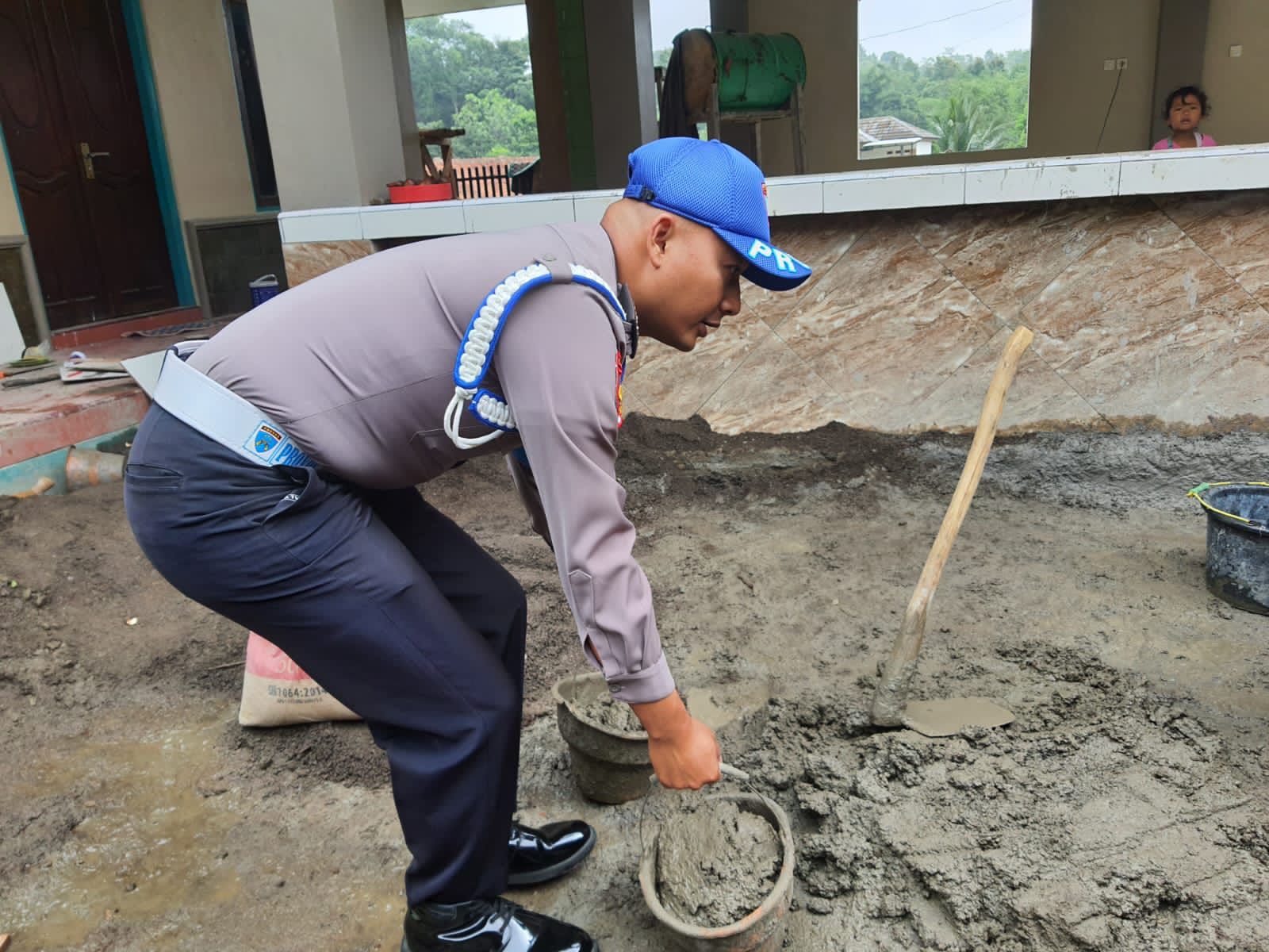 Dengan berseragam lengkap Bripka Feri Kanit Propam polsek Cingambul Polres Majalengka Polda Jabar mengikuti kegiatan gotong royong membangun sarana tempat pengajian salah seorang warga dilingkungan desa maniis kecamatan Cingambul kabupaten Majalengka,Minggu (12/03/2023).