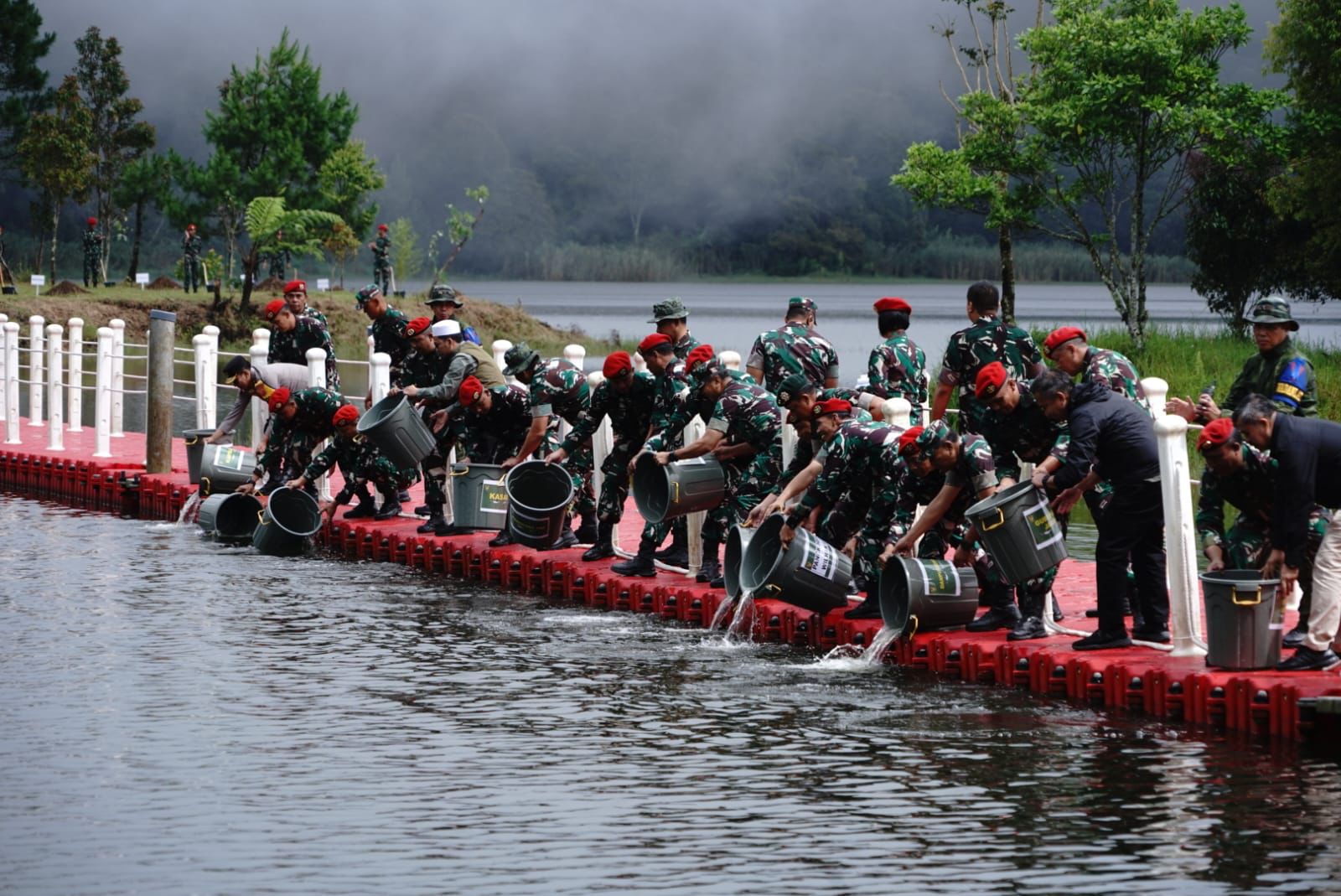 Bersama Panglima TNI, Bapak KASAD, Pj. Gubernur Jabar, Kapolda Jabar, Pangdam III Siliwangi dan PJU Mabes TNI serta sukarelawan dan komunitas dengan semangat dan berhati-hati melepas bibit ikan ke dalam air, dengan maksud memberikan mereka kesempatan untuk tumbuh dan berkembang biak.