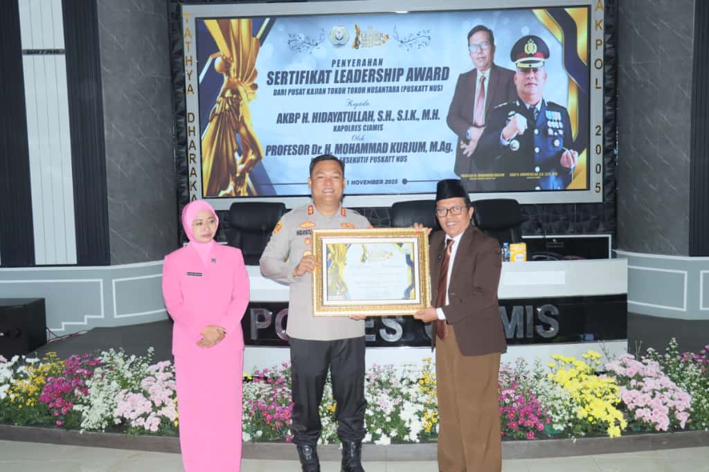 Ciamis – Polres Ciamis kembali menorehkan prestasi membanggakan di tingkat nasional. Kapolres Ciamis AKBP H. Hidayatullah, S.H., S.I.K., meraih penghargaan bergengsi kategori Most Integrity and Social Awareness Leader 2025 dari Indonesia Award Magazine dan Pusat Kajian Tokoh-Tokoh Nusantara (Puskatt Nus). Penghargaan tersebut diserahkan dalam kegiatan Ceremony Award yang digelar di Aula Pesat Gatra Polres Ciamis, dihadiri para pejabat utama Polres Ciamis, Kapolsek jajaran, Bhayangkari Cabang Ciamis, serta tim penilai dari kedua lembaga pemberi penghargaan, pada Selasa (11/11/2025).