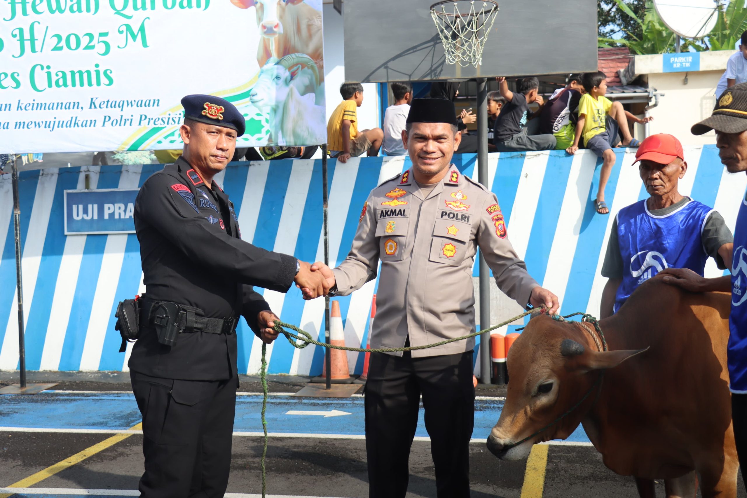 Menariknya, Polres Ciamis juga menyerahkan satu ekor sapi kepada Mako Brimob Batalyon D Pelopor Satbrimob Polda Jabar, sebagai simbol solidaritas dan sinergitas antarlembaga negara, sekaligus memperkuat tali silaturahmi di tengah semangat Idul Adha.