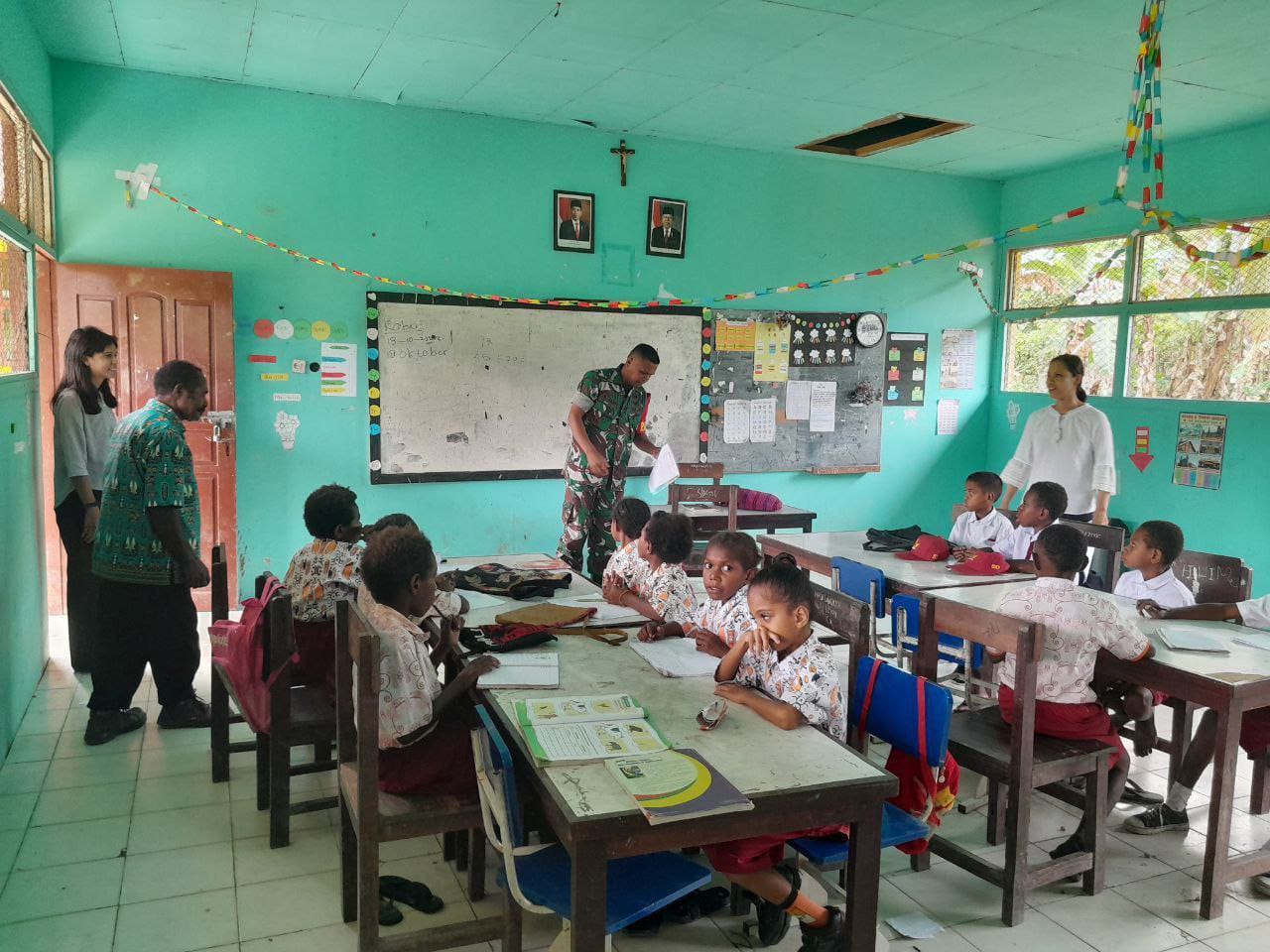 Timika – Sebagai bentuk nyata kepedulian TNI dalam melaksanakan pengabdian terhadap NKRI serta sebagai wahana dalam menambah pengetahuan pribadi, Babinsa Koramil 1710-07/Mapurujaya Sertu Yulius Nampe membantu proses belajar mengajar kepada siswa-siswi SD YPPK Santo Yosep di Kp. Tipuka, Distrik Mimika Timur, Kab. Mimika, Selasa (24/10/2023).