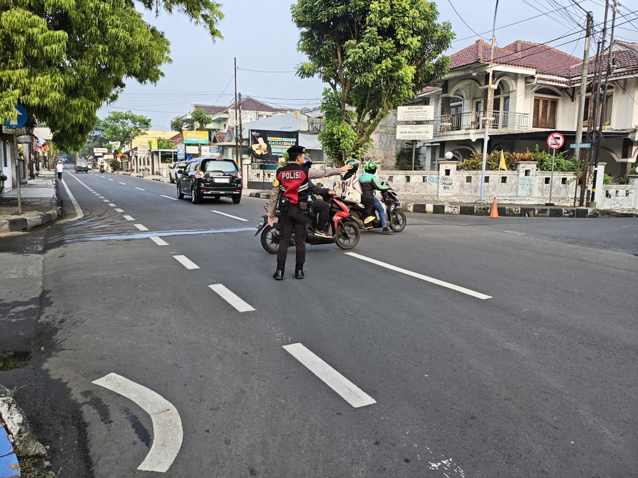 Personel melakukan pelayanan masyarakat mengatur lalu lintas serta membantu menyebrang warga. Ini dilakukan dalam rangka untuk memberika kenyamanan pengguna jalan serta meminimalisir angka fatalitas kecelakaan lalu lintas.