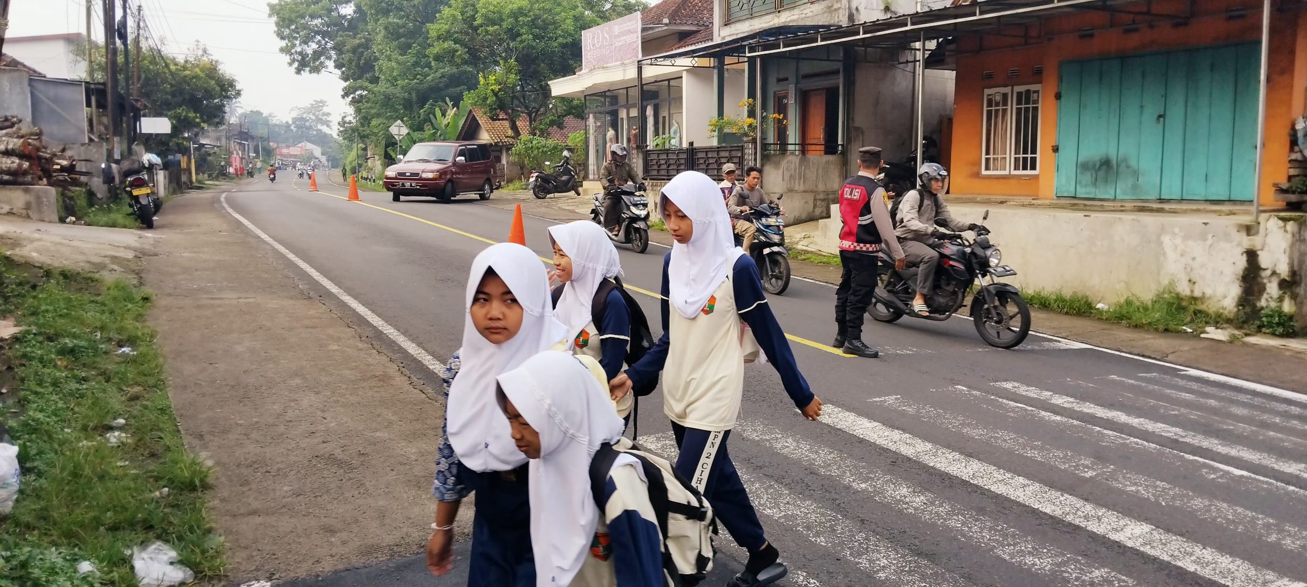 Pelayanan Masyarakat, Polsek Cihaurbeuti Polres Ciamis Bantu Anak Menyebrang di Area Sekolah