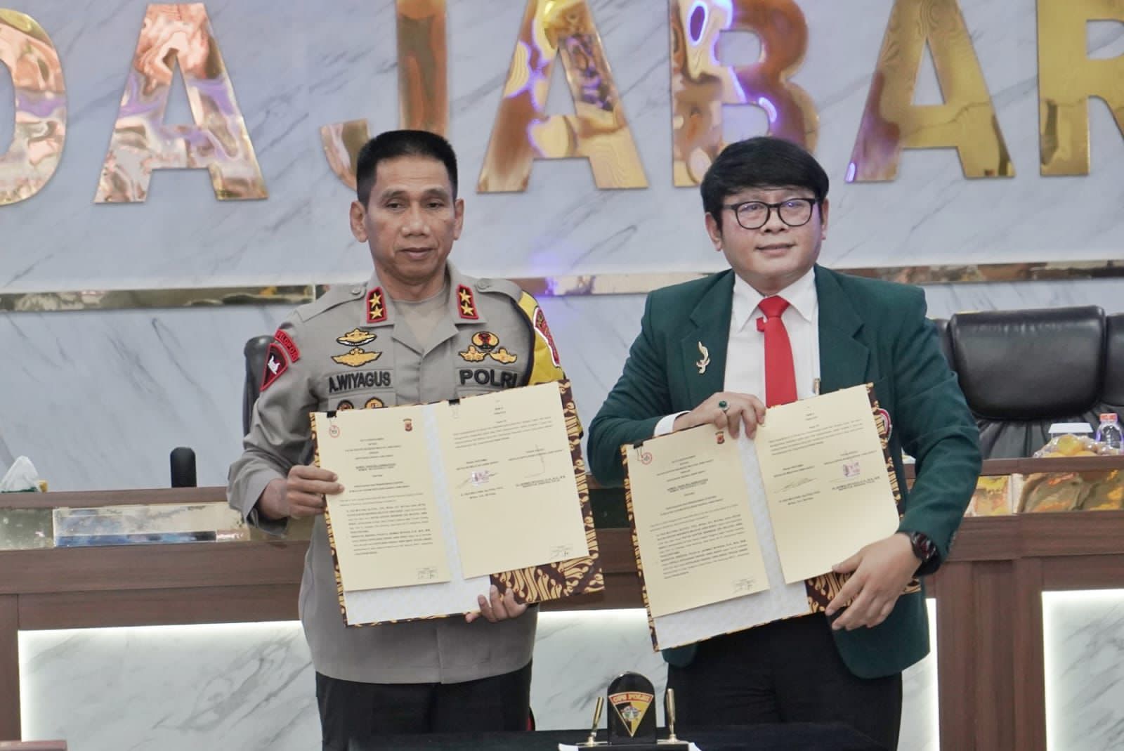 Jabar–Kapolda Jabar Irjen Pol Dr. Akhmad Wiyagus, S.I.K., M.Si., MM didampingi Wakapolda Jabar dan Pejabat Utama Polda Jabar melaksanakan Penandatanganan Naskah Nota Kesepahaman antara Polda Jabar dengan Ikatan Dokter Indonesia Wilayah Jawa Barat, bertempat di Aula Herman Sudjana Diwirja, Senin (6/5/2024)