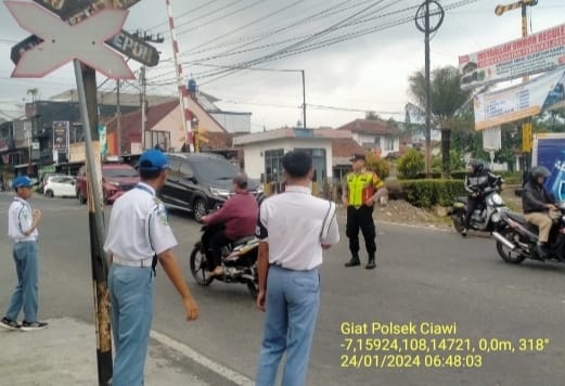 POLRES TASIK KOTA –Personel Polsek Ciawi Polres Tasik Kota menggelar kegiatan strong point dengan melakukan pengamanan dan pengaturan lalu lintas di sejumlah titik rawan kecelakaan lalu lintas, rawan kemacetan, pusat keramaian serta lokasi sekolahan Rabu ( 24/01/2024)