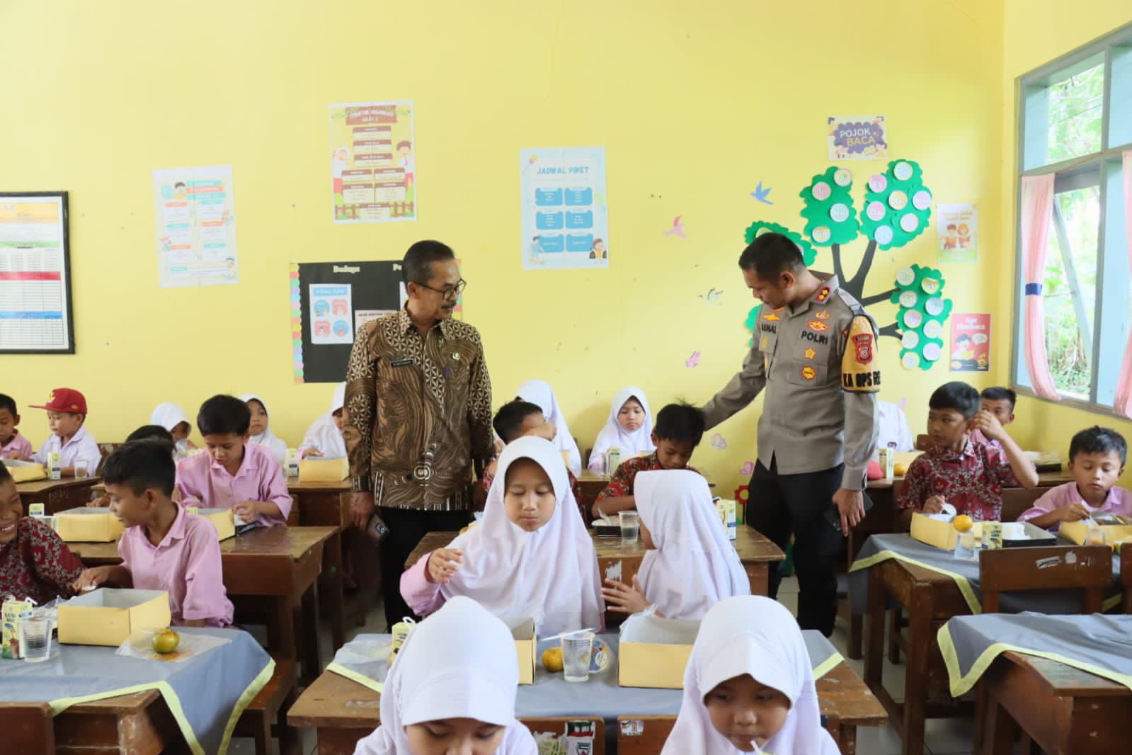 Polisi Bagikan Makan Bergizi Gratis Kepada Siswa SDN 2 Kadupandak Kec. Tambaksari Kab. Ciamis