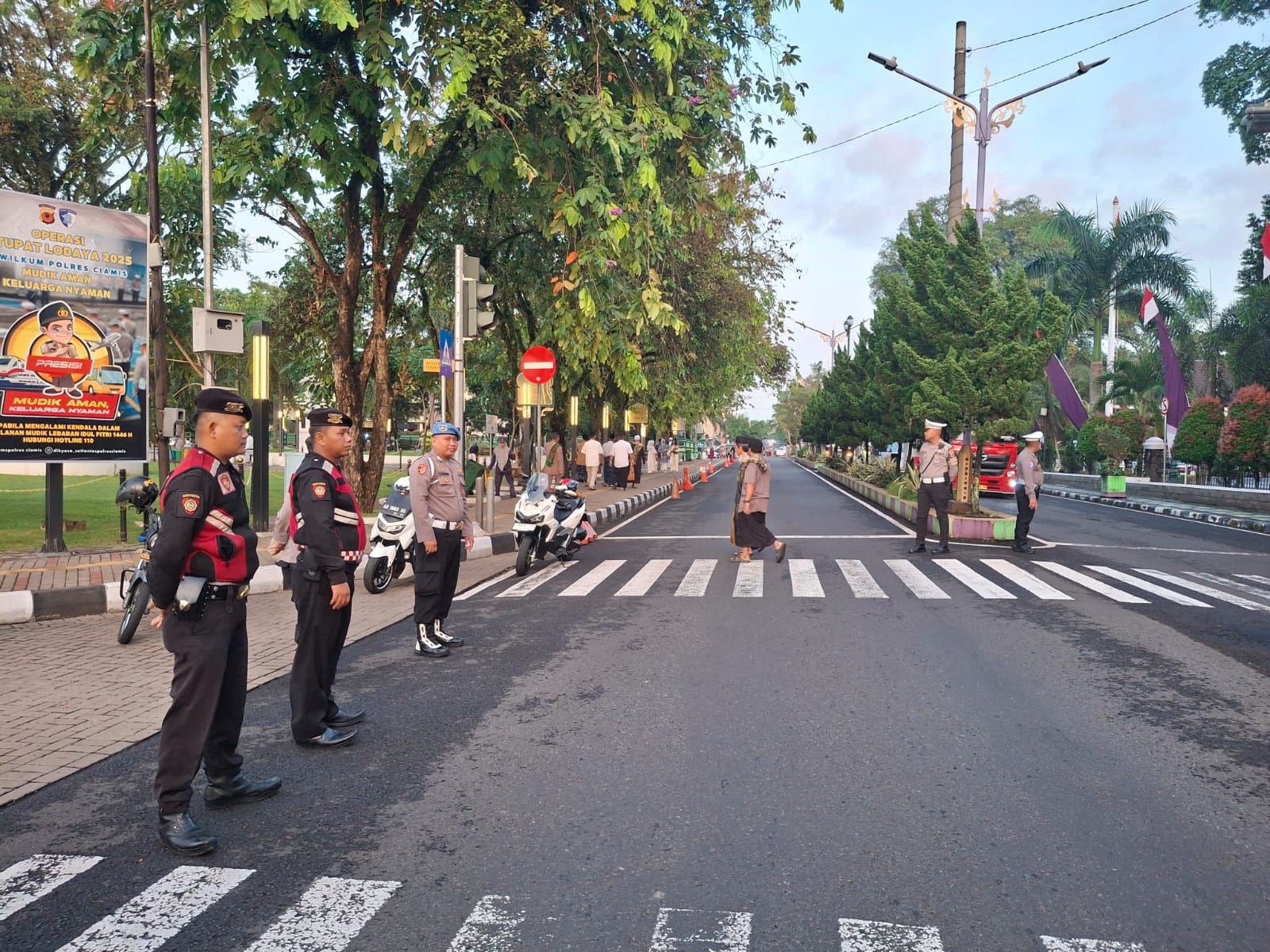 Mereka bersiaga di sekitar lokasi yang menjadi tempat pelaksanaan Ibadah Sholat Ied Hari Raya Idul Adha 1446 Hijriyah. Dimana mereka terlihat di sekitar Alun Alun Ciamis, Ciamis, Kabupaten Ciamis, Jawa Barat, Jumat (6/6/2025).