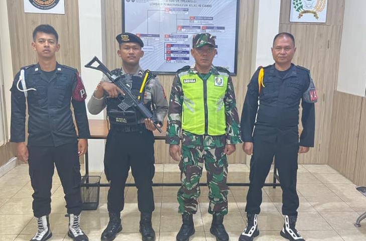 Terlihat Bripda Fani Yanuar melakukan koordinasi bersama anggota Babinsa untuk melaksanakan pengamanan di area Lapas Kelas II B Ciamis. Anggota yang bertugas merupakan anggota Polri yang sehari-hari bertugas di Satuan Samapta Polres Ciamis Polda Jabar.