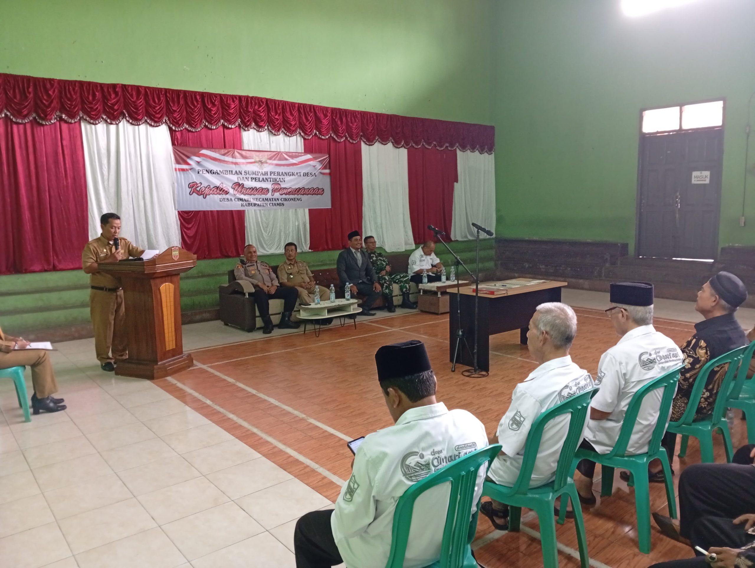 Kegiatan pelantikan dihadiri oleh Camat Cikoneng Heri Rianto, S.Sos., M.Si., perwakilan Danramil 1302 Cikoneng, unsur pemerintahan kecamatan, perangkat desa, Bhabinkamtibmas, Babinsa, serta tokoh agama dan masyarakat Desa Cimari. Pelantikan dilakukan oleh Kepala Desa Cimari Riky Aryana, S.H., dengan rangkaian acara resmi mulai dari pembukaan, pembacaan ayat suci Al-Qur’an, pembacaan SK, pengambilan sumpah, penandatanganan berita acara, sambutan, hingga penutup. Kehadiran kepolisian dalam kegiatan tersebut juga memastikan jalannya acara tetap tertib mengingat pelantikan perangkat desa merupakan momen penting dalam pembangunan tata kelola pemerintahan desa.