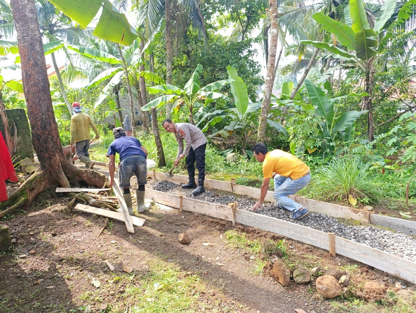Kegiatan monitoring tersebut dilaksanakan oleh Ps. Panit II Binmas Polsek Cikoneng Bripka Vikky Alfian, S.H., M.M., yang turun langsung ke lokasi pembangunan sejak pukul 08.00 WIB hingga selesai. Kehadiran Polri di tengah kegiatan pembangunan ini bertujuan untuk memastikan proses pembangunan berjalan lancar, aman, serta sesuai dengan harapan masyarakat, sekaligus mencegah potensi gangguan kamtibmas di lingkungan sekitar.