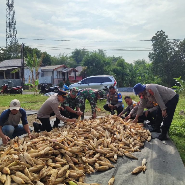 Proses panen dilakukan secara gotong royong oleh seluruh personel yang hadir. Mereka terlibat dalam pengupasan kulit jagung, pengumpulan hasil panen,