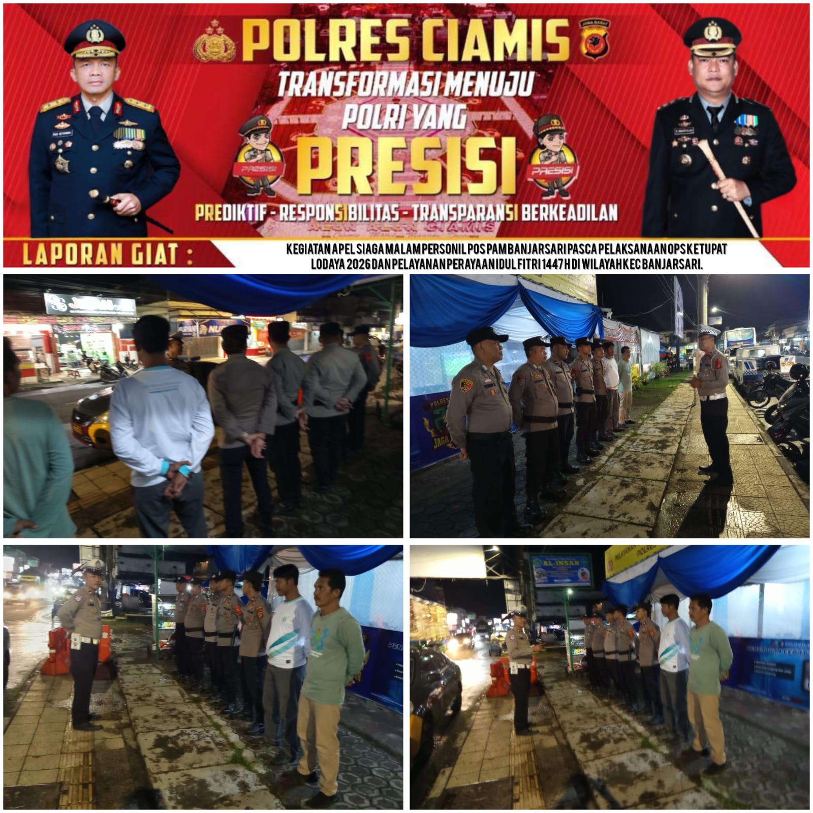 CIAMIS ~ Personel Pos Pengamanan Banjarsari Polres Ciamis melaksanakan apel malam pasca Operasi Ketupat Lodaya 2026. Apel ini berlangsung di Pos Pengamanan Banjarsari, Alun Alun Banjarsari, Kecamatan Banjarsari, Kabupaten Ciamis, Jawa Barat, Jumat, 27 Maret 2026, malam.