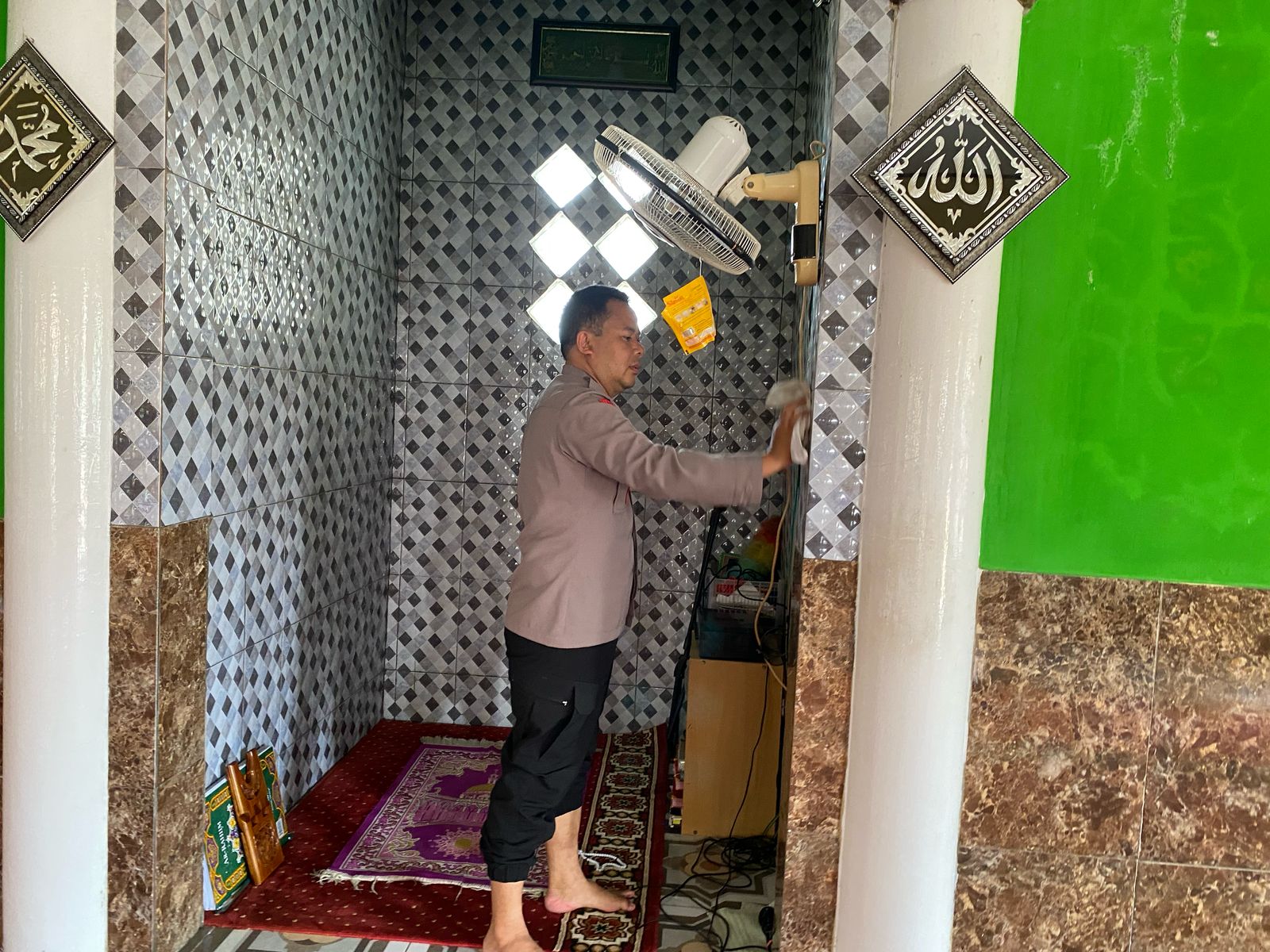 “Kami membersihkan tempat wudlu, kemudian toilet dan lantai masjid yang biasanya dipenuhi jamaah solat tarwih,” ujar Kapolres Majalengka AKBP Indra Novianto melalui Kapolsek Dawuan AKP Asep Saepudin.