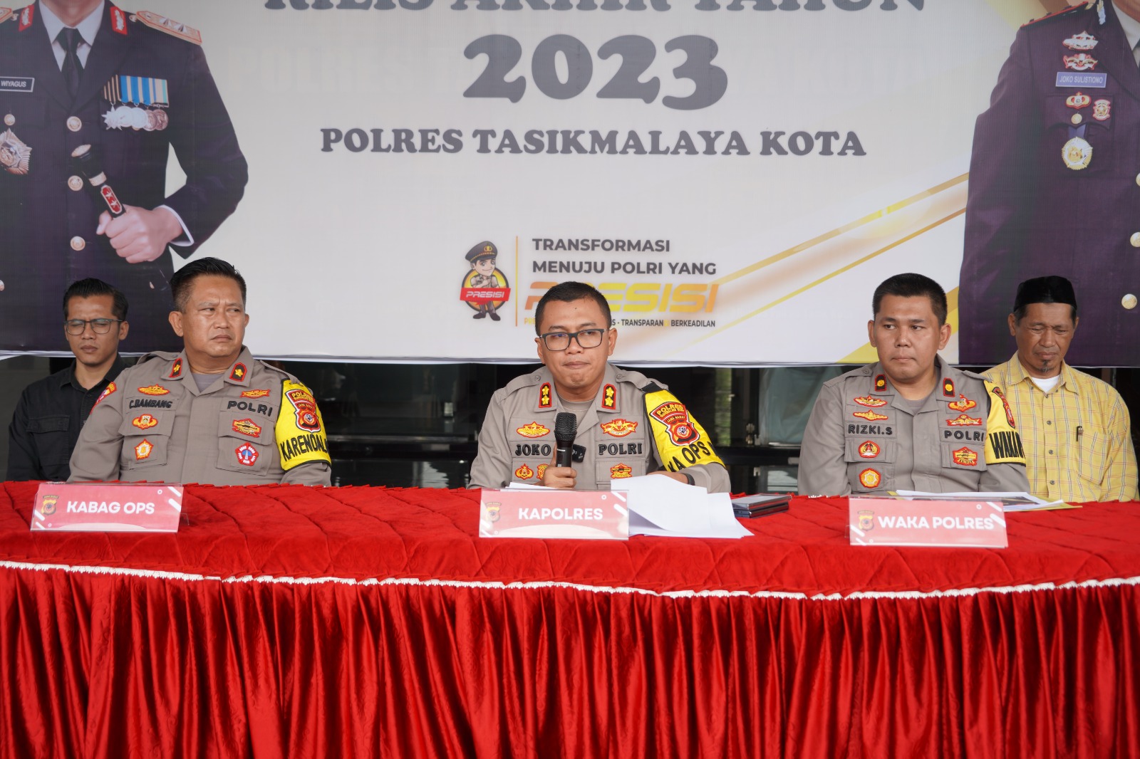 Rilis Akhir Tahun 2023 Polres Tasikmalaya Kota dihadiri Wakapolres Rizki Syawaludin Akbar, S.H.,S.I.K. M.H. ,Kabag, Kasat Reskrim, Kasat Lantas dan Kasat Narkoba dan Kapolsek Jajaran.