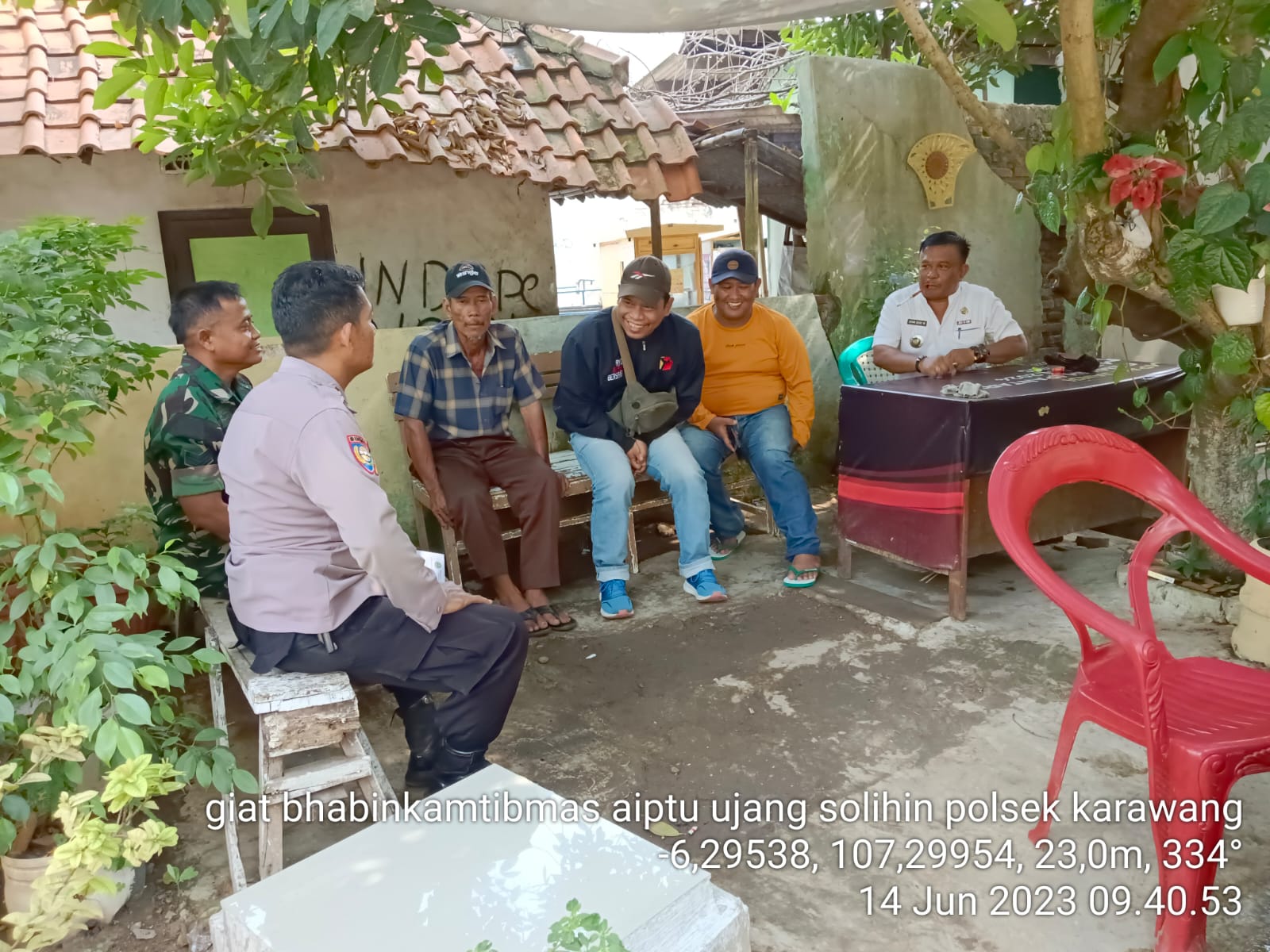 Karawang – Bhabinkamtibmas Polsek Karawang Kota Polres Karawang, Aiptu Ujang Solihin bersama Babinsa TNI-AD Serka Hendri melaksanakan giat sambang kepada masyarakat berikan himbauan antisipasi C3 dan gukamtibmas kepada warga Jatirasa Timur, RT.001/009, Kelurahan Karangpawitan, Kecamatan Karawang Barat. Rabu (14/6/2023).