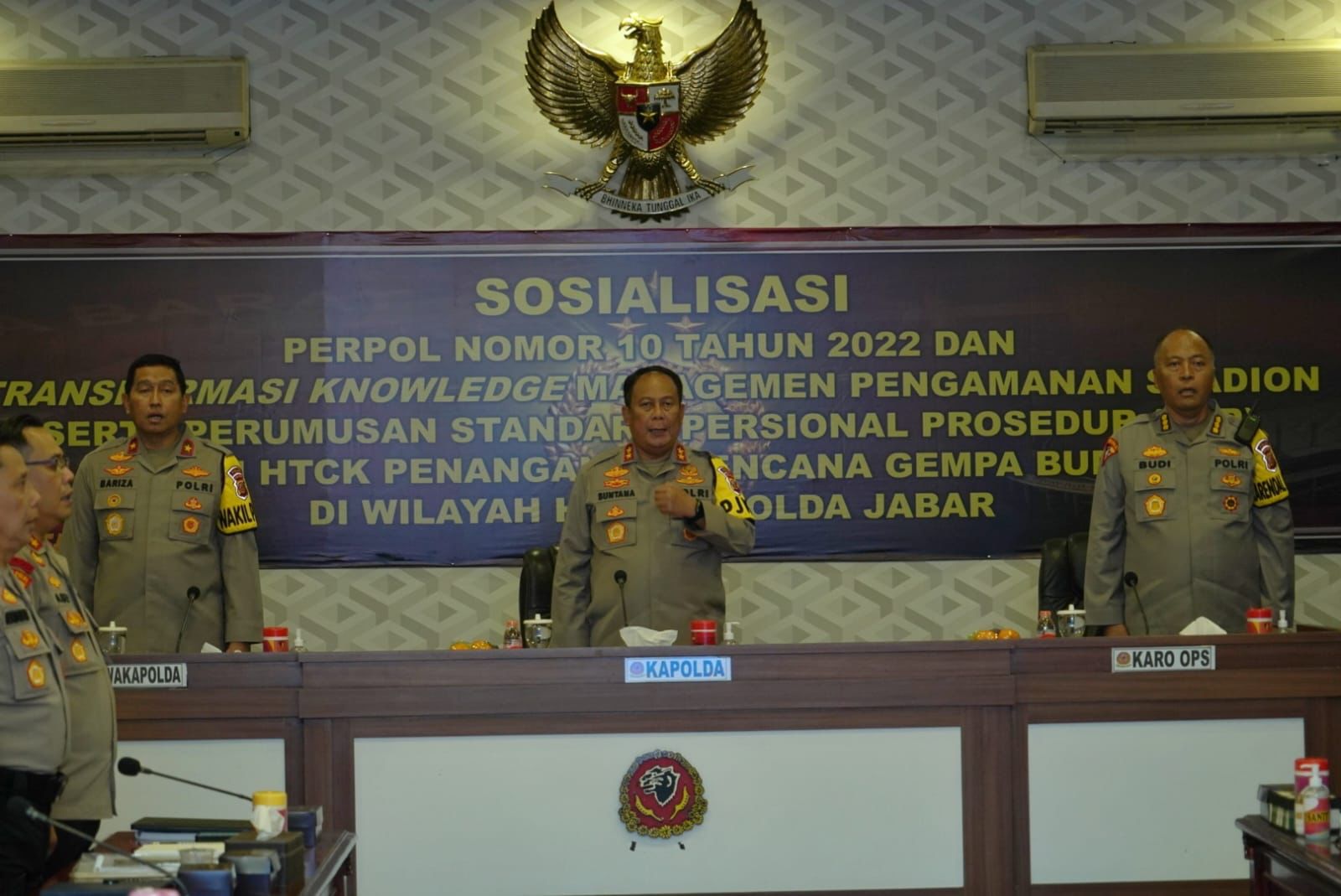 Karoops Polda Jabar melaksanakan kegiatan Sosialisasi Peraturan Kepolisian Negara RI Nomor 10 Tahun 2022 tentang Pengamanan Penyelenggaraan Kompetisi Olahraga, Pelatihan Manajemen Pengamanan Stadion, Perumusan SOP dan HTCK penanganan Bencana Gempa di Wilayah Hukum Polda Jabar pada Kamis (16/02/2023) yang bertempat di Aula Herman Sudjana-diwirja Mapolda Jabar.