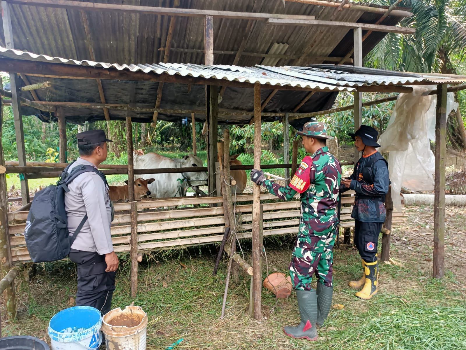 Pulau Hanaut ~ Dalam rangka mendukung Program Ketahanan Pangan Nasional, Polisi Penggerak Polsek Pulau Hanaut Aipda Suryadi bersama Babinsa Kopda Sandi Tyas Dewanto melaksanakan kegiatan patroli dialogis dan Sambangi Peternak Sapi di Desa Rawa Sari Kec.Pulau Hanaut Kab.Kotim Prov.Kalteng, Jum’at (03/10/2025) Pagi.
