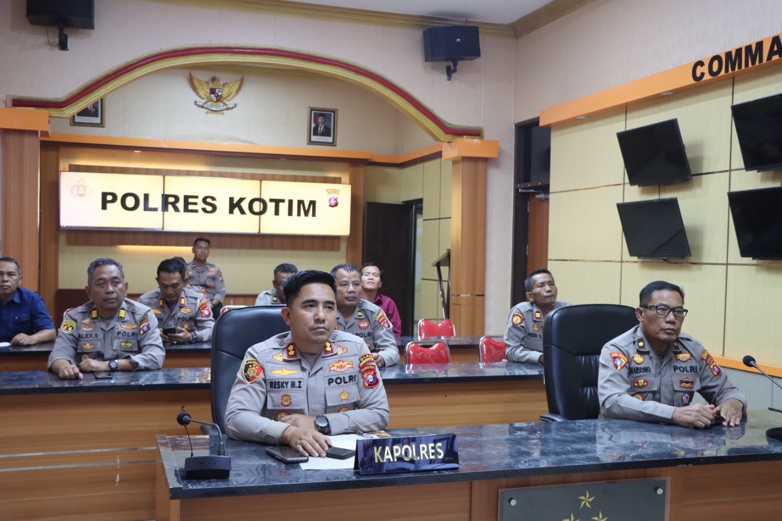 Polres Kotim mengikuti zoom meeting di Aula Loby Polres Kotim yang dipimpin langsung oleh Bapak Kapolres Kotim AKBP Resky Maulana Zulkarnain, S.H., S.I.K., M.H. dan didampingi oleh KabagOps Polres Kotim Kompol Marsono S.H.,M.M. serta dihadiri oleh para Pejabat Utama Polres Kotim (PJU).