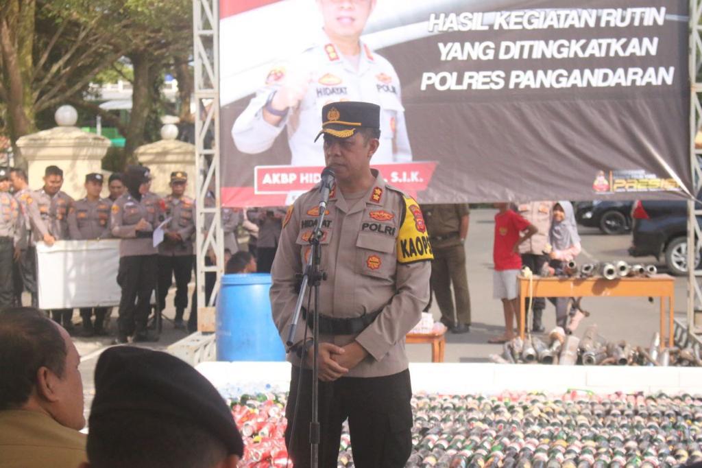 Kapolres Pangandaran AKBP Hidayat, S.H., S.I.K mengatakan, “sering kita dapati berbagai tindak pidana yang berawal dari minuman keras, tidak jarang kami dapati pelaku kejahatan beralasan melakukan tindakannya karena efek dari minuman keras, maka dari itu kami pada saat melaksanakan Operasi Penyakit Masyarakat(PEKAT) menyita ribuan botol miras guna menjaga stabilitas kamtibmas agar warga pangandaran bisa lebih merasa aman”.