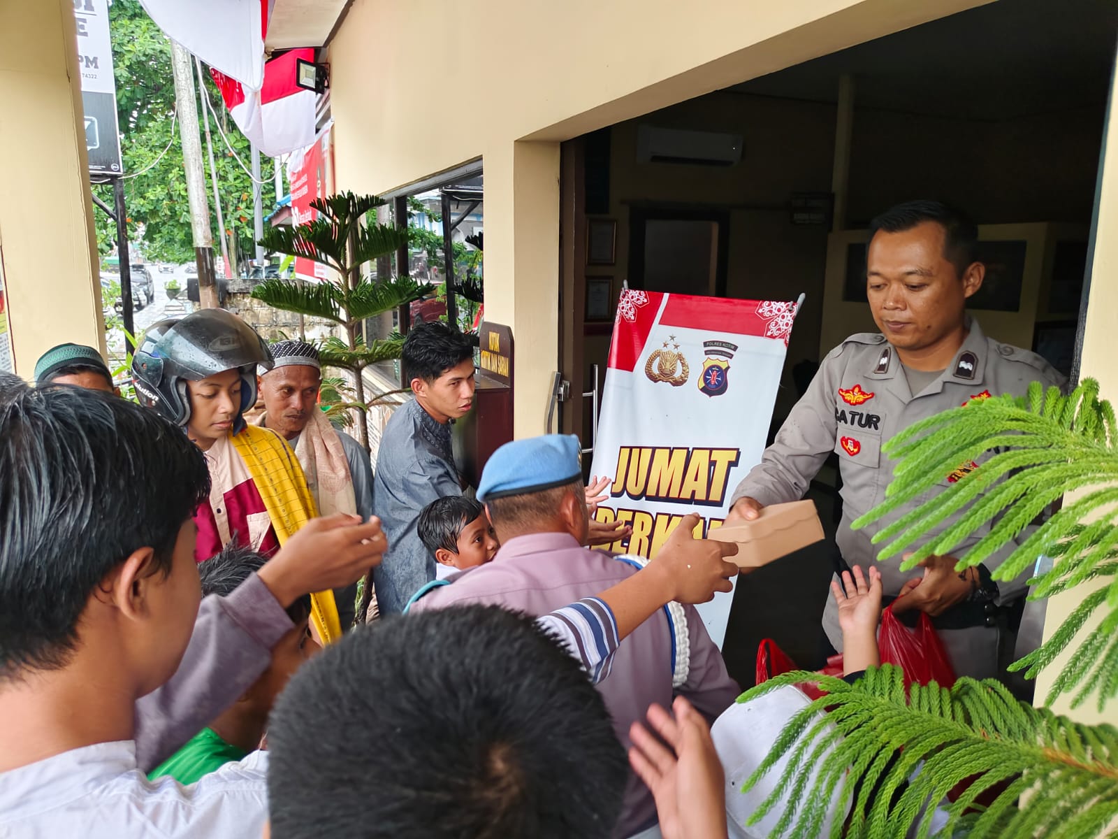 Kegiatan ini dilaksanakan di halaman depan Mapolsek KP. Mentaya, yang bersebrangan langsung dengan masjid kota Al-Madinatul Mubaroqah. Para jamaah yang baru selesai melaksanakan ibadah salat Jumat tampak antusias menerima bungkusan berisi makanan dan minuman dari petugas kepolisian.