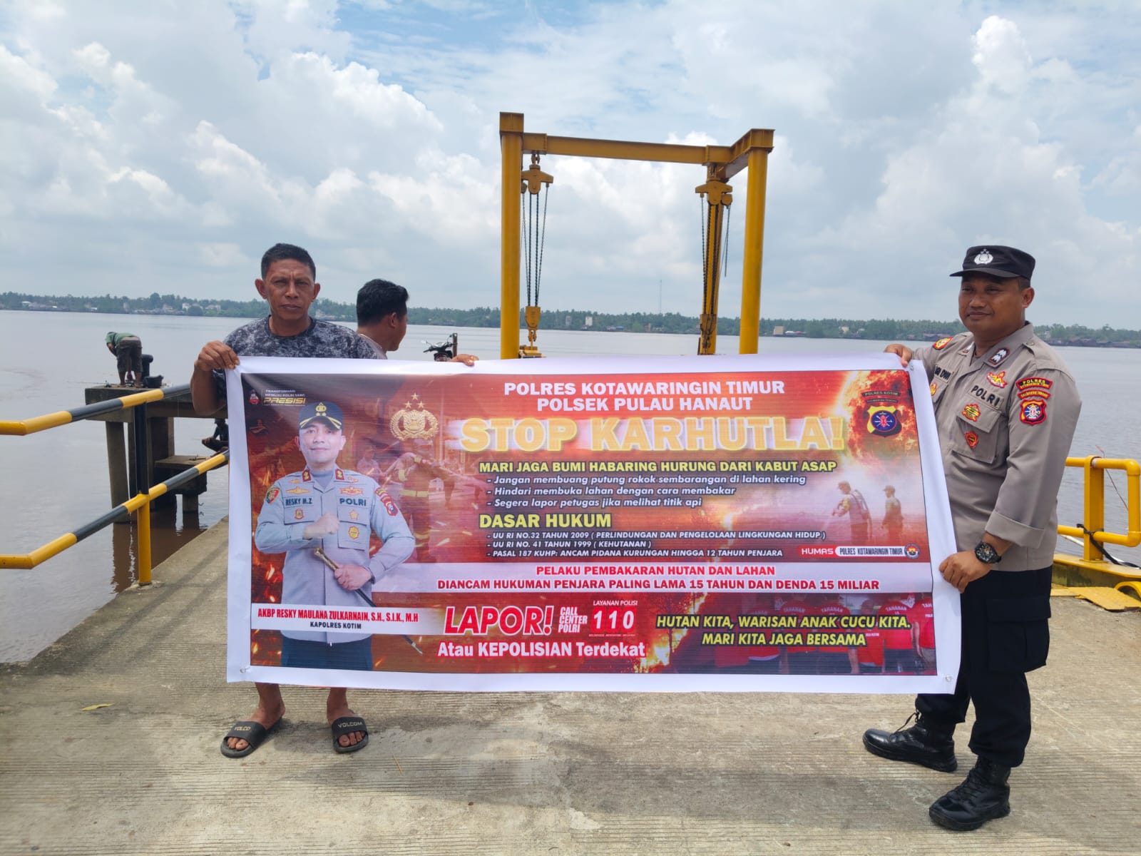 Kapolres Kotim jajaran Polda Kalteng AKBP Resky Maulana Zulkarnain, S.H., S.I.K., M.H. melalui Kapolsek Pulau Hanaut Iptu Purwono menjelaskan “bahwa masyarakat harus peduli dan harus mengetahui bahwa perbuatan membakar hutan dan lahan juga dapat berakibat sanksi hukum kepada pelakunya, disampaikan juga kepada masyarakat untuk tidak lagi membakar, karena apabila terbukti membakar walapun tujuannya membersihkan kebun, akan diproses hukum dengan sanksi penjara 15 tahun dan denda Rp 5 miliar”. Jelas Kapolsek.