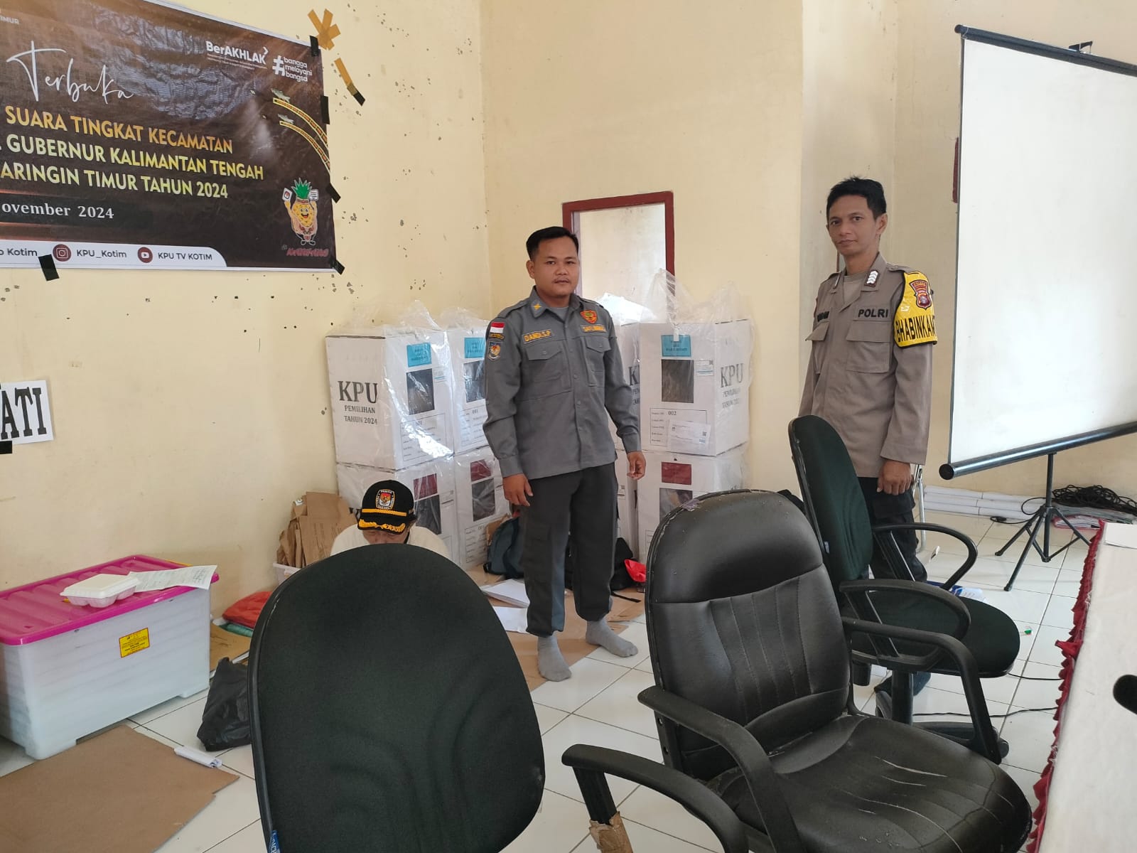 Kotim – Personil Polsek Antang Kalang jajaran Polres Kotim Polda Kalteng bersiaga menjaga kegiatan rapat pleno Rekapitulasi hasil penghitungan suara Pilkada 2024 yang dilaksanakan di aula Hapakat desa Tumbang Kalang Kec. Antang Kalang, Sabtu (30/11/2024).