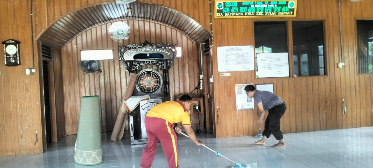 Pulau Hanaut ~ Dalam rangka memperingati Isra Mi’raj Nabi Muhammad SAW 1447 Hijriah, Polsek Pulau Hanaut melaksanakan kegiatan kerja bakti bersama masyarakat di Masjid Al – Muhktar Desa Bapinang Hulu Kec.Pulau Hanaut Kab.Kotim Prov.Kalteng, Jum’at(16/1/2026) Pagi.
