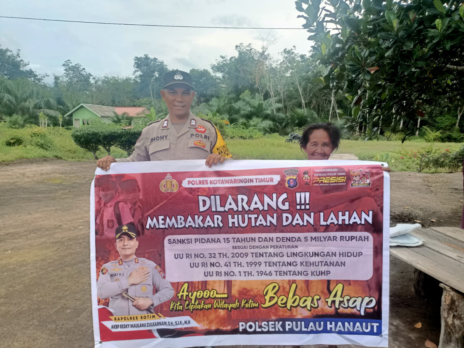 Kapolres Kotim jajaran Polda Kalteng AKBP Resky Maulana Zulkarnain, S.H., S.I.K., M.H. melalui Kapolsek Pulau Hanaut Iptu Purwono menjelaskan “bahwa masyarakat harus peduli dan harus mengetahui bahwa perbuatan membakar hutan dan lahan juga dapat berakibat sanksi hukum kepada pelakunya, disampaikan juga kepada masyarakat untuk tidak lagi membakar, karena apabila terbukti membakar walapun tujuannya membersihkan kebun, akan diproses hukum dengan sanksi penjara 15 tahun dan denda Rp 5 miliar”. Jelas Kapolsek.