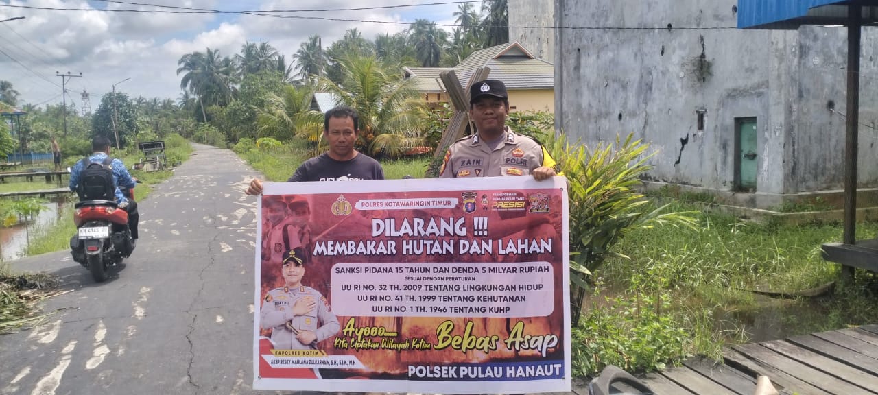 Kapolres Kotim jajaran Polda Kalteng AKBP Resky Maulana Zulkarnain, S.H., S.I.K., M.H. melalui Kapolsek Pulau Hanaut Iptu Purwono menjelaskan “bahwa masyarakat harus peduli dan harus mengetahui bahwa perbuatan membakar hutan dan lahan juga dapat berakibat sanksi hukum kepada pelakunya, disampaikan juga kepada masyarakat untuk tidak lagi membakar, karena apabila terbukti membakar walapun tujuannya membersihkan kebun, akan diproses hukum dengan sanksi penjara 15 tahun dan denda Rp 5 miliar”. Jelas Kapolsek.