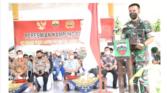 Berita Nias Utara,((sumut)— Dandim 0213/Nias buka secara resmi Kampung Pancasila bertempat di Kelurahan Pasar Lahewa Kecamatan Lahewa Kabupaten Nias Utara dihadiri oleh Kapolres Nias, Wakil Bupati Nias Utara, Mewakili Danlanal Nias, Pabung Kodim Nias, Dansub Den POM ½-5 Nias, Kepala UPP Kelas III Lahewa, Asisten I Kab. Nias Utara, Camat Lahewa, Kapolsek Lahewa, Para Danramil, Lurah Pasar Lahewa, Para Tokoh Agama, Masyarakat, Adat dan Pemuda serta para pelajar tingkat SMP sederajat dan SMA sederajat, yang diawali dengan pemotongan pita di pintu masuk gapura pasar kelurahan Lahewa, Jum’at (11/03/2022).