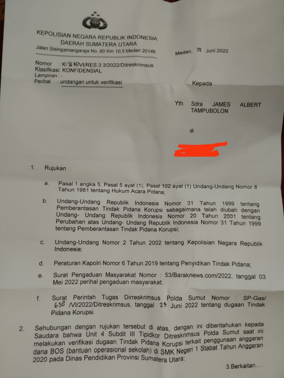 Baraknews Sumatera Utara- Pada tanggal 23 Juni 2022 James Tampubolon menerima undangan untuk verifikasi terkait pelaporan yang di lakukan kepada Kepala Sekolah SMKN 1 Stabat Bapak Ilyas terkait Dana Bos Tahun 2020. Dengan Nomor : K/2635/VI/RES.3 .3/2022 /Ditreskrimsus, James Tampubolon menghadiri undangan Verifikasi yang di beritahukan dari pihak Tipidkor Ditreskrimsus Polda Sumut yang bertemu dengan Bapak IPTU IP. Simamora, S.H.,M.H ( Penyelidik Unit 4 Subdit III Tipidkor ).