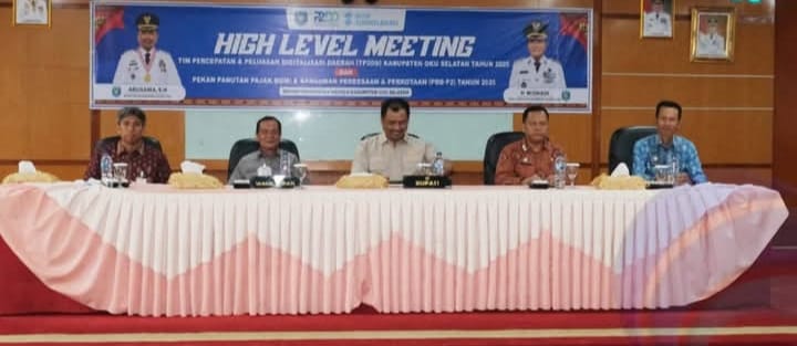 MUARADUA – Bupati Ogan Komering Ulu Selatan, Abusama, SH., menghadiri High Level Meeting (HML), Elektronikasi Transaksi Perangkat Daerah (ETPD) dan Pekan Panutan Pajak, serta Pemberian Reward/Penghargaan bagi Wajib Pajak di Ruang Serasan Seandanan Pemkab OKU Selatan, Kamis, 22 Mei 2025.