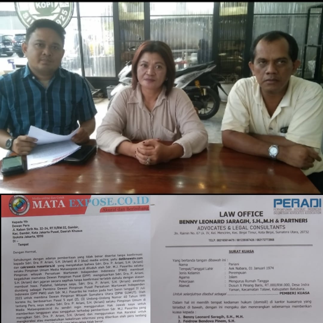 Feidrow Bendova Pinem . SH , Benny Leonard Saragih SH. MH selaku kuasa Hukum P. Ariani juga mengatakan , kasus Pencemaran Nama baik pada klien kami akan di segera di tindak lanjuti dengan melayang surat Somasi terhadap kedua Media antara lain Detiknewstv .com dan Cakrawalanusantara.co.id. serta sudah melayangkan Somasi Ke Dewan Pers sebagai permintaan Hak jawab dari klien kami