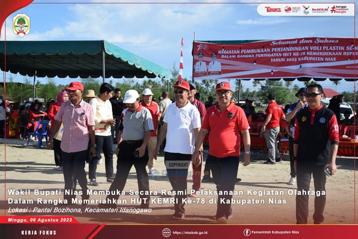 Kabupaten Nias — Untuk memeriahkan peringatan HUT ke-78 Kemerdekaan Republik Indonesia Tahun 2023 di Kabupaten Nias, Pemerintah Kabupaten Nias melaksanakan kegiatan olahraga salahsatunya Pertandingan Voli Plastik se-Kabupaten Nias. Pelaksanaan sekaligus pembukaan kegiatan olahraga ini dilaksanakan di Pantai Bozihona, Kecamatan Idanogawo.Minggu, 06 Agustus 2023