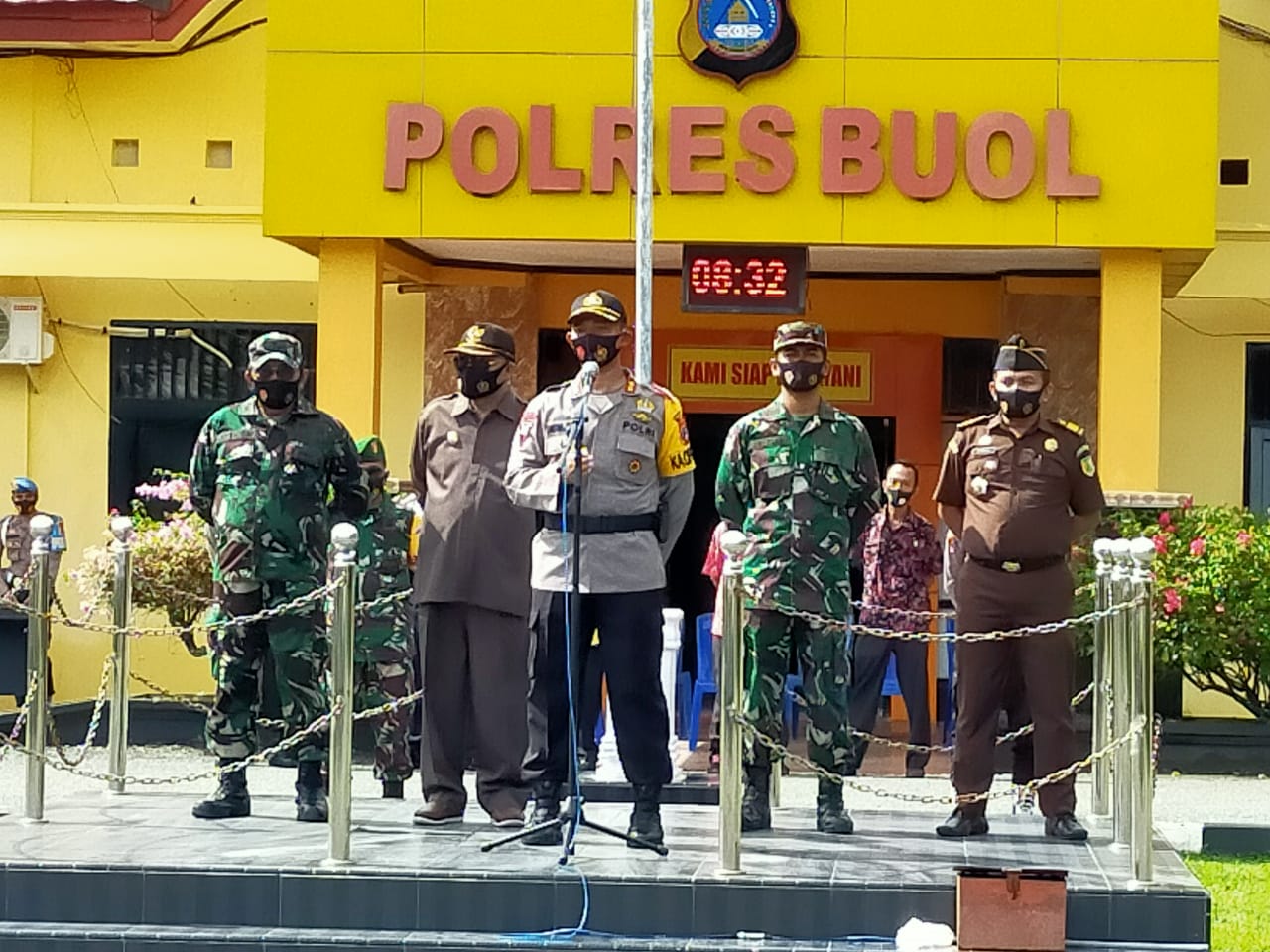Berita Mapolres Buol (Sulteng) –— Gelar kegiatan pelepasan Satgas Yustisi Kabupaten Buol dalam rangka penegakkan hukum protokol kesehatan guna mencegah penyebaran Covid-19 di wilayah Kabupaten Buol, bertempat di Mako Polres Buol, Kamis (24/09/2020)