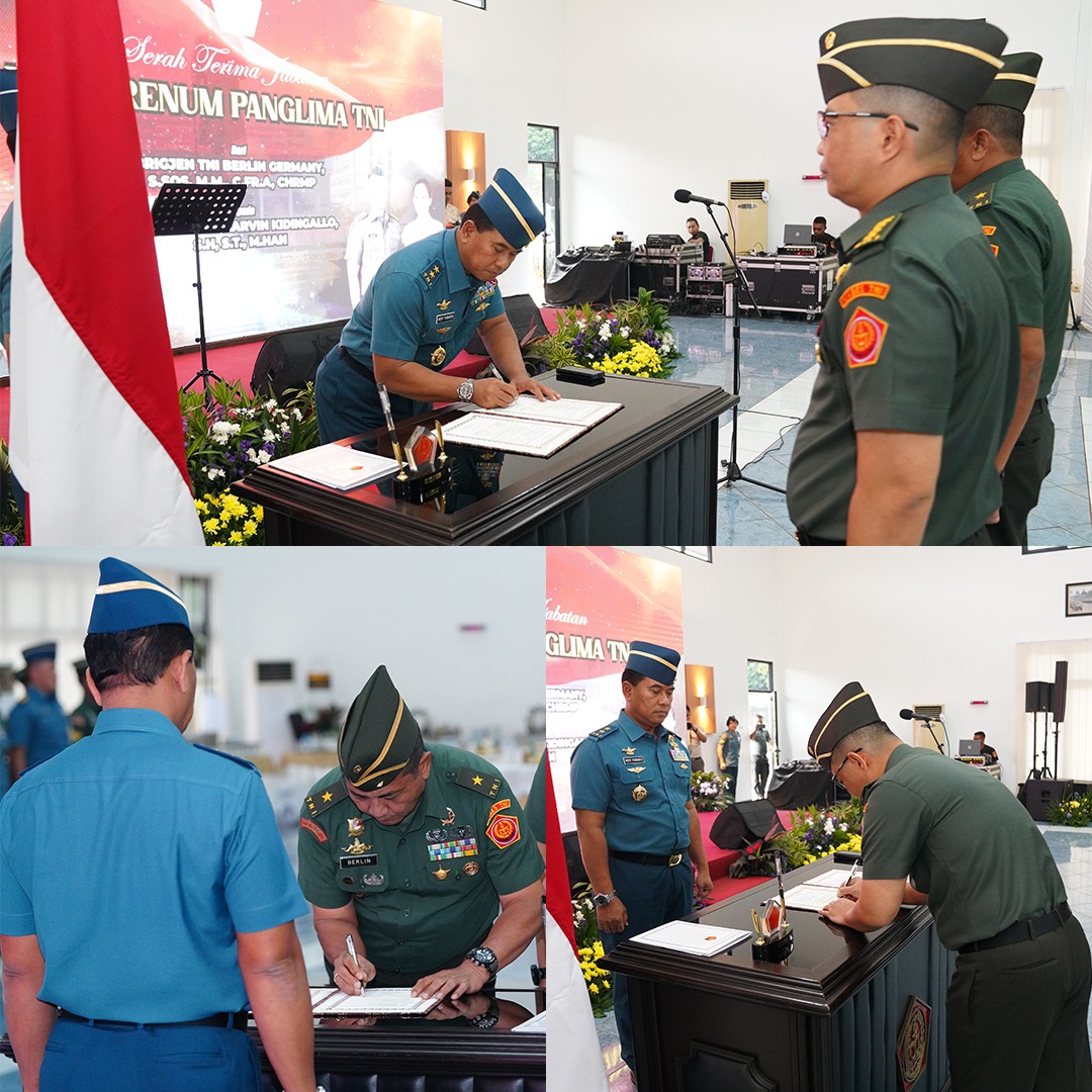 Jakarta – Asrenum Panglima TNI, Laksda TNI Hery Puranto, S.E., M.M., memimpin upacara Serah Terima Jabatan (Sertijab) Wakil Asisten Staf Kebijakan Strategis dan Perencanaan Umum Panglima TNI (Waasrenum Panglima TNI) dari Brigjen TNI Berlin Germany, S.Sos., M.M., C.Fr.A., CHRMP. kepada Kolonel Arh Harvin Kidingallo, S.H., S.T., M.Han., di Mabes TNI Cilangkap, Jakarta Timur, Selasa (12/12/2023).