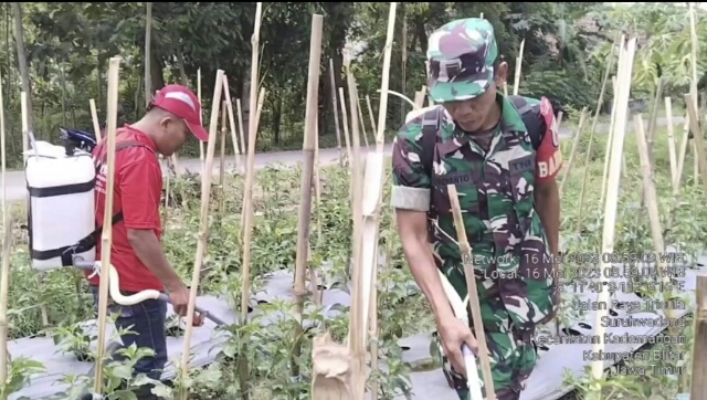 Baraknews Kodim Blitar – Sebagai wujud peran aktif dalam meningkatkan ketahanan pangan diwilayah, Babinsa Koramil 0808/10 Kademangan Kodim 0808/Blitar Sertu Trisdianto, melaksanakan kegiatan membantu warga atau petani untuk melaksanakan penyemprotan tanaman cabe, bertempat di Desa Suruhwadang Kec. Kademangan Kab. Blitar, Selasa (16/5/2023).